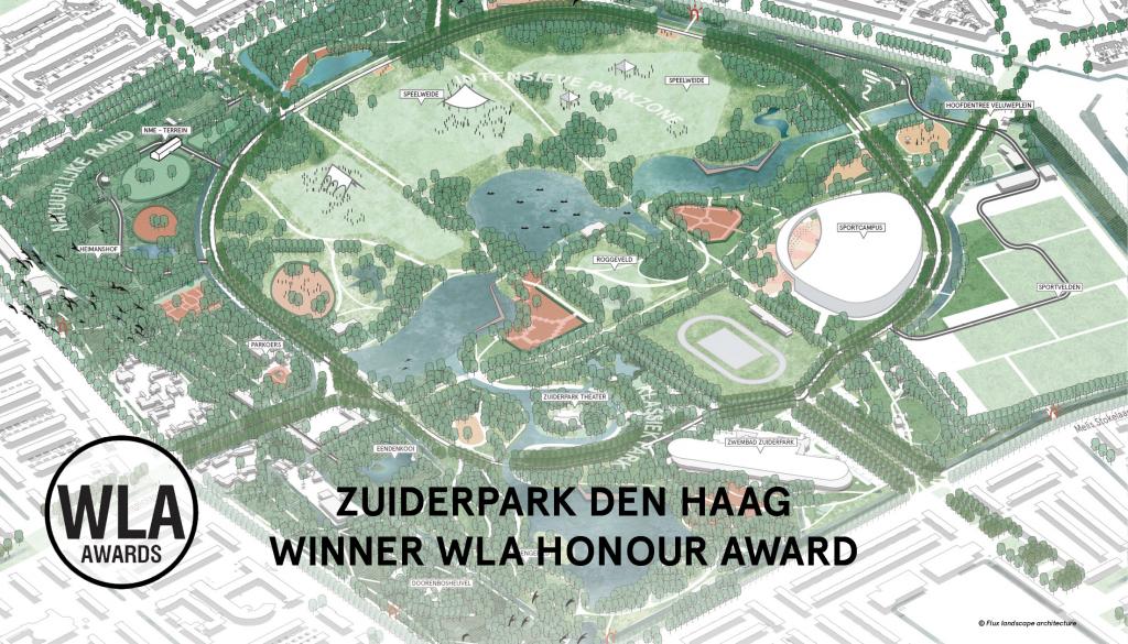 Met het project Zuiderpark Den Haag wint Flux de WLA Honour Award 2022! Uit meer dan 240 inzendingen wereldwijd, is Flux geselecteerd in de categorie Concept- Design. Het plan werd na selectie voor de longlist, gehonoreerd met de Honour Award. Voor het Zuiderpark in Den Haag heeft Flux een ruimtelijke visie heeft ontworpen. De druk op het park wordt de komende jaren flink vergroot doordat er in omliggende wijken 10.000 woningen worden bijgebouwd. Tegelijkertijd neemt ook het belang van het park voor klimaatadaptatie en biodiversiteit steeds meer toe. Dit vraagt om een herziening van het Zuiderpark. Flux heeft een visie ontwikkeld waarin ontmoeting, klimaat, veiligheid, gezondheid en leefbaarheid centraal staan.