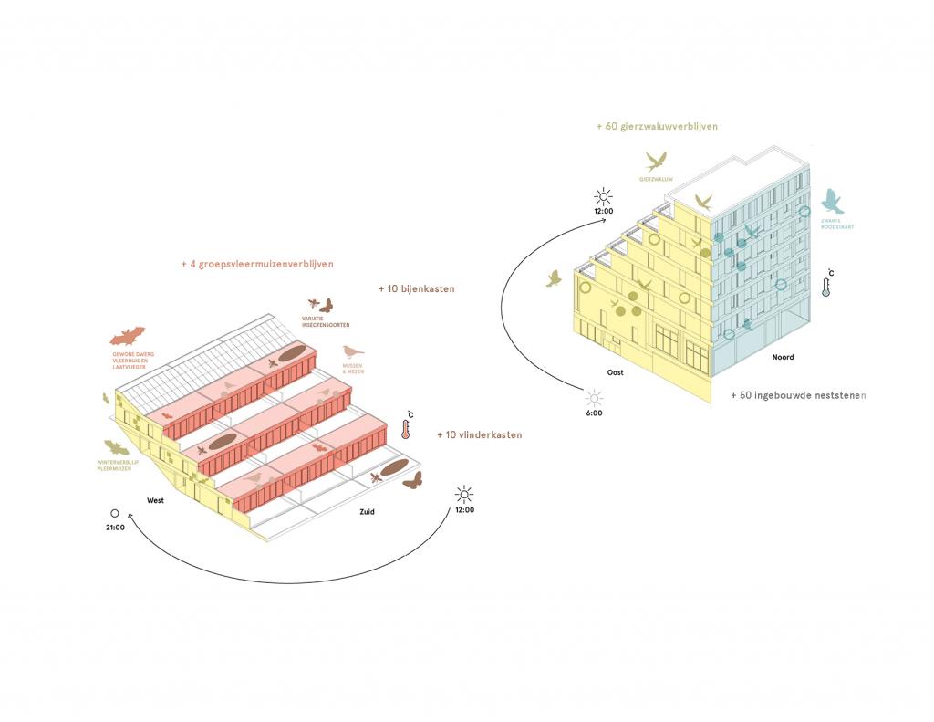 On the south side of the plan is a green valley, which forms an almost barrier-free transition from the landscape to the housing by the stepped building with its lush roof landscape. By opening the blocks we created a large outdoor space with a series of collective gardens with different identities. In line with the cultural axis and located at the gatehouse, the ‘green balcony’ of Leidsche Rijn comes with a large grass staircase in the slope, a new place to stay with great quality for Leidsche Rijn centre and Utrecht.