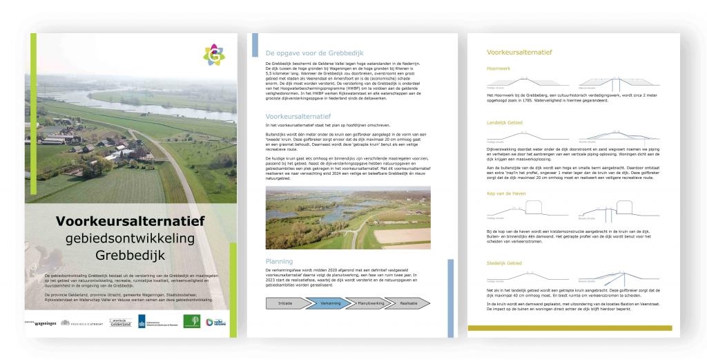 The preferred alternative for the Grebbedijk in Wageningen has been presented. An important characteristic is the creation of a stepped dike profile for the Grebbedijk. The stepped dike profile will provide more space for pedestrians on the dike and to enable a walk from the Grebbedijk to Wageningen. For more information: website Grebbedijk