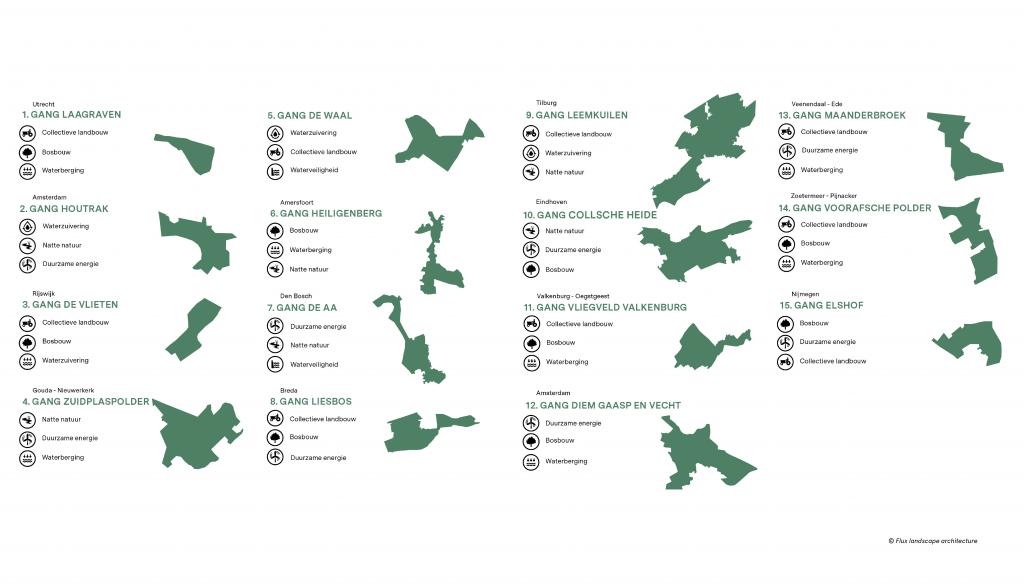 The results of the design research Gangen have been presented. The research, which was started by Flux two years ago together with Synchroon, proposes to create 15 new landscape parks on the edges of several Dutch cities, where spatial quality is under pressure. The landscape parks can play a crucial role in major landscape challenges such as water storage, food production and increasing biodiversity. At the same time, they can create new recreational routes between city and countryside and offer opportunities for medium-density housing in the periphery. The concept thus answers both landscape challenges and the demand for new housing. The concept transcends the scale of landowners or municipalities and thus calls for new regional coalitions.
