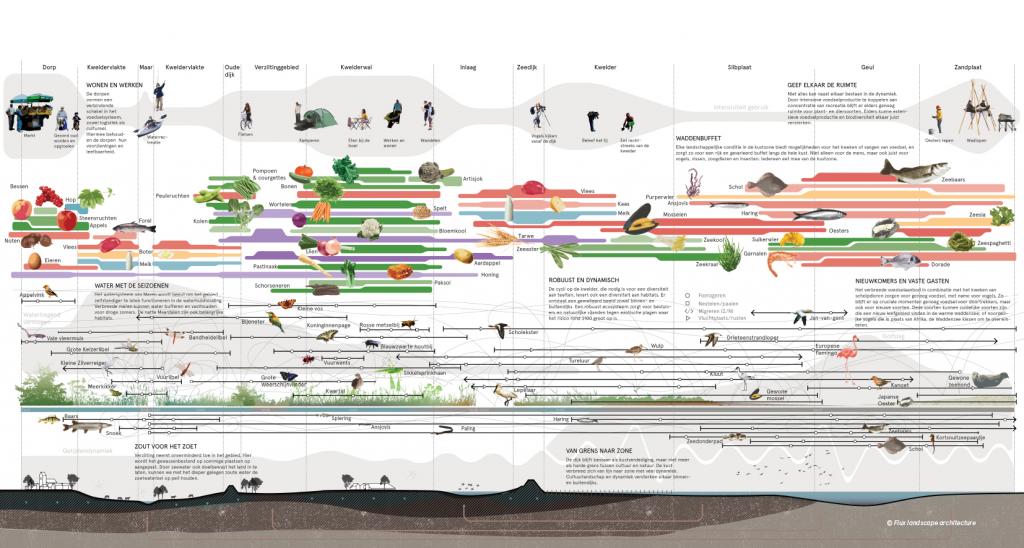 Nine landscape architects from the Netherlands and abroad took up the challenge to design the future landscape of Groningen. They sought for climate adaptive solutions at several locations in this unique landscape. All locations are located in a proverbial slice of cake between Schiermonnikoog and Zuidlaren. Roughly located in the flow valley of the Drentse Aa and the Hunze: the rivers that have largely formed Groningen. Flux has been working on the coastal zone of the Waddensea, all plans can be seen in the exposition of Sponsland