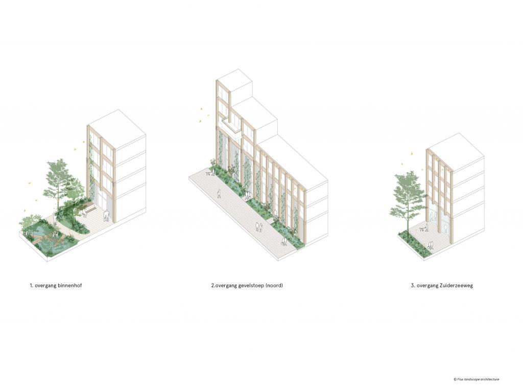 Bij hoogbouw sta je niet langer verder van de natuur af, maar benutten we juist de verticale stijgpunten om de verschillende lagen te verbinden met groen. Het landschap in Horizons vormt een serie van groene buitenruimtes waar bewoners elkaar kunnen ontmoeten en een plek kunnen vinden om te verblijven, bewegen, spelen of ontspannen in de luwte van de stad. Binnen de serie van tuinen kent iedere tuin een eigen gebruik, waarbij we onderscheid maken in collectieve tuinen voor de bewoners, maar ook doelbewust plekken creëren die ontoegankelijk zijn voor de mens.