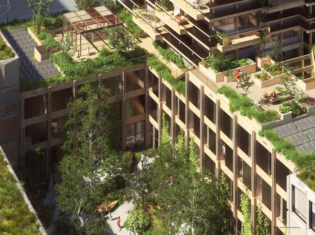 Amsterdam, Sluisbuurt, in opdracht van Ballast Nedam i.s.m. Paul de Ruiter Architects, Buro Loo, Alba Concepts, Vogelbescherming Nederland, renders door WAX, competitie, circulaire stad, gezonde stad, klimaat adaptieve stad, verdichting, Flux landscape architecture, 2021