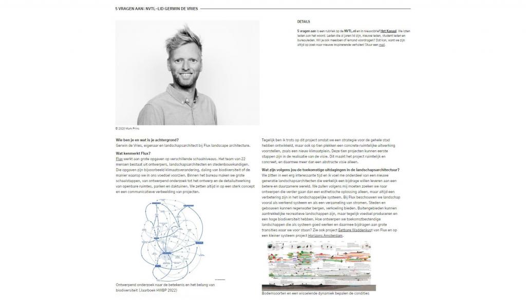 Voor de rubriek ‘5 vragen aan’ is Gerwin de Vries geïnterviewd over zijn bureau Flux landscape architecture. In de rubriek worden nieuwe leden, studentleden en leden die al langer lid zijn geïnterviewd over hun interesses en rol in de landschapsarchitectuur.