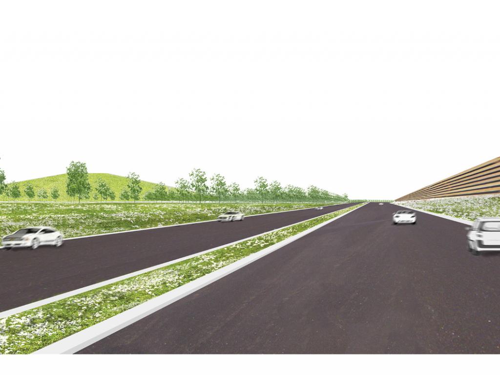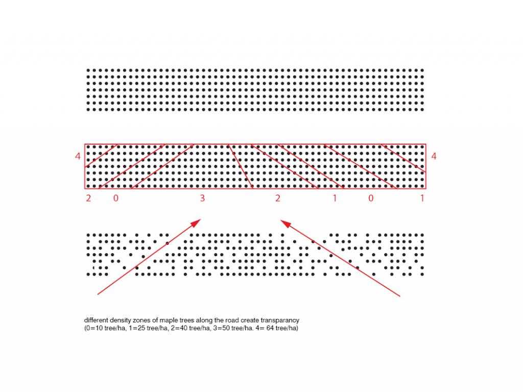 Door 4 verschillende soorten esdoorns aan te planten wordt op de voorgrond een samenhangend wegbeeld gecreëerd. Een iconische bomenzee zal gedurende het seizoen van geel naar rood verkleuren en daarmee bijdragen aan de natuur- en seizoensbeleving. Door de bomen in geleidelijk verlopende dichtheden aan te planten worden zowel zichten, moire effecten en dichte gesloten beelden geboden. De nieuwe parkheuvels zullen afhankelijk van het perspectief op de achtergrond soms stil liggen en soms langzaam met de weggebruiker meebewegen.
